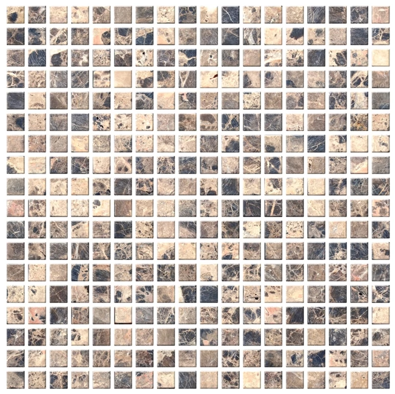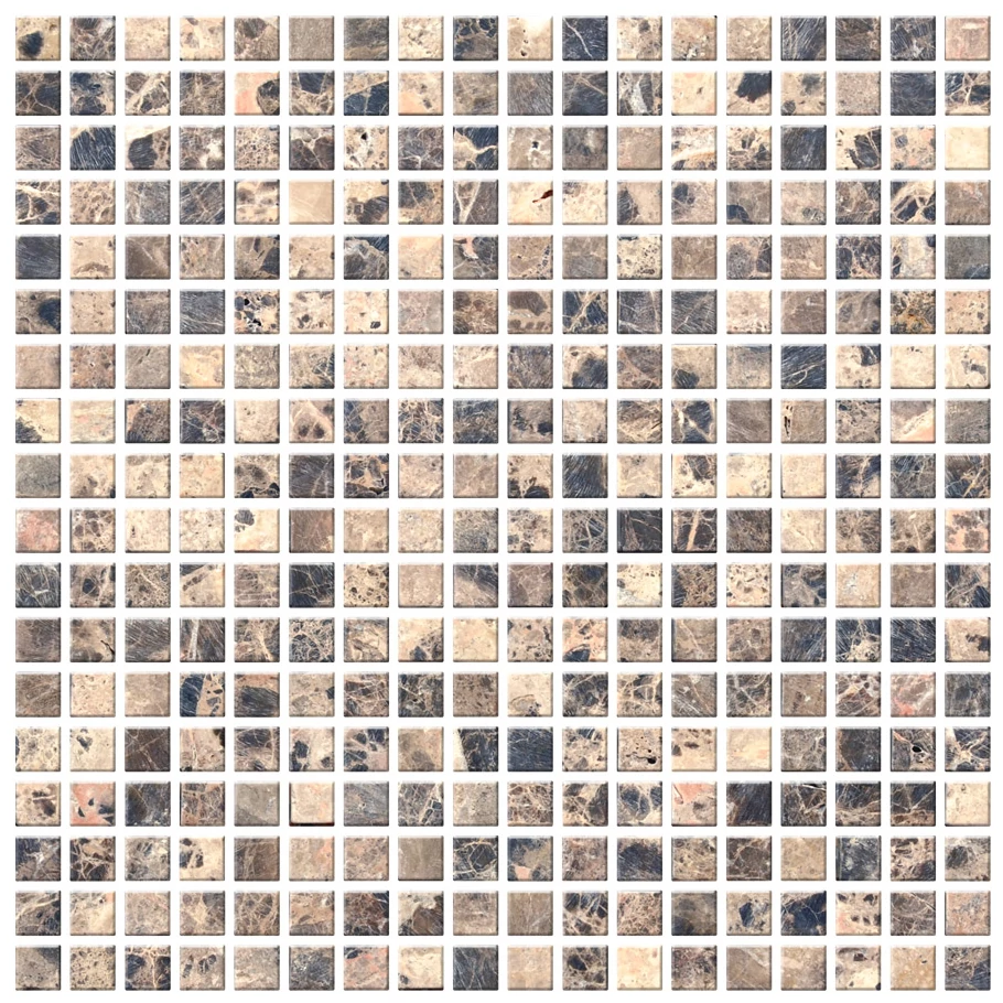 Mozaika Kamienna A-MST08-XX-004 o wymiarach 30x30 cm to zestaw drobnych kwadratowych elementów połączonych w dużą całość. Kolorystyka jest stonowana, opiera się na mieszance naturalnych odcieni kamienia: od jasnych beżów, przez szarości, aż po ciemniejsze brązy i grafity. Całość tworzy zróżnicowany, ale spójny wzór o powierzchni kamiennej, który jednocześnie prezentuje wyrazistą strukturę surowca naturalnego.