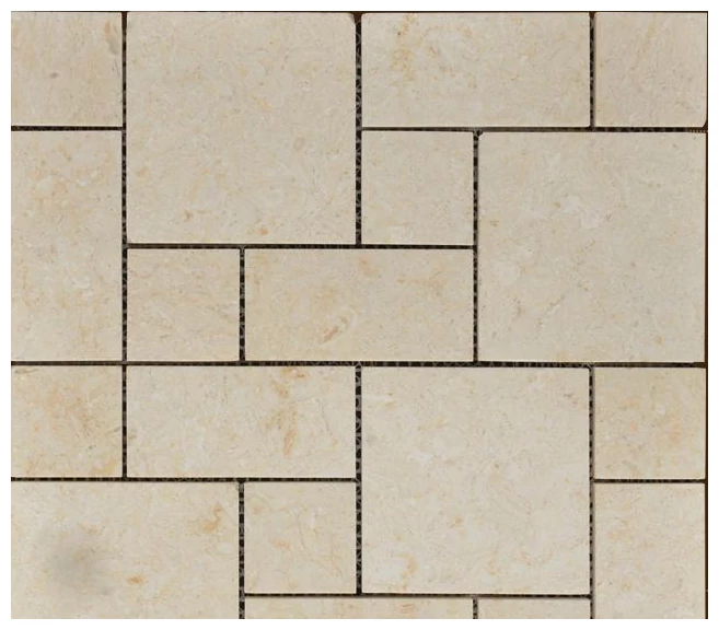 Ułożenie elementów w nieregularne prostokąty i kwadraty o zróżnicowanych wielkościach tworzy duży format mozaiki. Takie rozmieszczenie jest praktyczne i atrakcyjne wizualnie, pozwala na ciekawe zestawienia w przestrzeni. Nie jest to mała, drobna mozaika, lecz zdecydowanie duża mozaika kamienna kuchenna i łazienkowa, co sprawia, że pokrywa większy obszar jednorodnie i szybko.