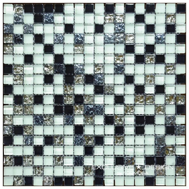 Duża mozaika kamienna o wymiarze 30x30 cm to połączenie różnych faktur i kolorów. Wzór składa się z kwadratowych elementów - szklanych i kamiennych, które doskonale łączą mat i lekki połysk. Widoczne są trzy dominujące kolory: biel, czerń oraz odcienie szarości i beżu, które pojawiają się na kamiennych fragmentach o nierównej powierzchni. Taka mozaika nadaje się dla osób szukających niebanalnej dekoracji, która jednocześnie pozostaje stonowana i nowoczesna.