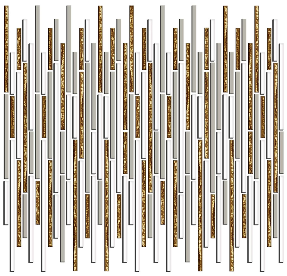 Mozaika Szklana A-MGL06-XX-032 to produkt o wyraźnym, geometrycznym układzie elementów, który przyciąga uwagę. Wzór składa się z podłużnych, prostokątnych kawałków szkła, ułożonych w nieregularny sposób. Kolory to przede wszystkim biel i odcienie szarości z wyrazistymi, złotymi akcentami, które nadają całości lekko błyszczącego charakteru. Produkt jest powierzchni błyszczącej, co podkreśla jego nowoczesny i schludny wygląd, jednocześnie wpływa na łatwość utrzymania czystości.