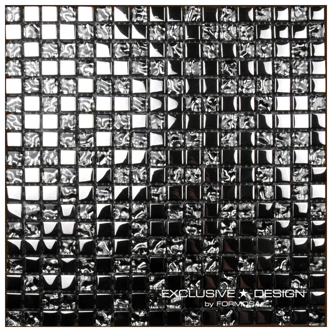 Mozaika Szklana A-MGL08-XX-013 30x30 przedstawia ciemne, błyszczące kwadraty w układzie dużej, wyraźnie zarysowanej siatki. Szklane elementy mają różnorodną fakturę - od całkowicie gładkich do lekko pofalowanych i nieregularnych, co nadaje powierzchni ciekawy efekt przestrzenny. Kontrast pomiędzy matowymi a błyszczącymi fragmentami przełamuje monotonię, oferując wizualną głębię. Kolory to przede wszystkim odcienie czerni i grafitu, które mają stonowany charakter, a jednocześnie nadają ścianie wyrazistość.