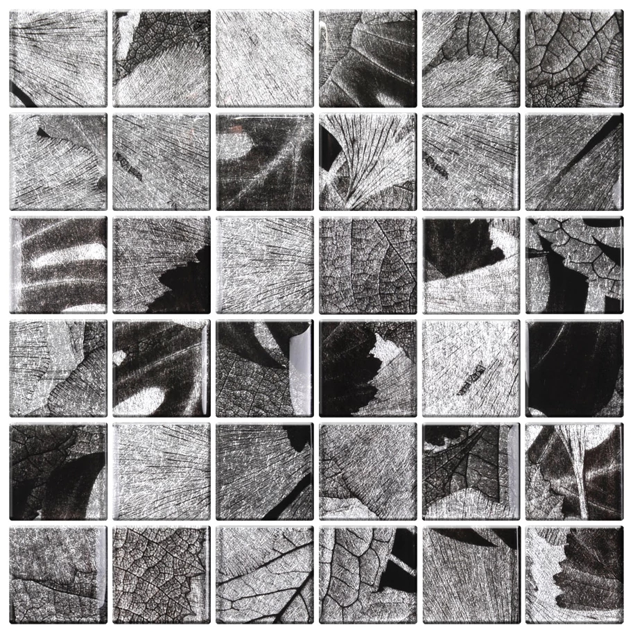 Ta duża mozaika szklana to propozycja dla osób, które szukają niestandardowego wzoru. Na jej powierzchni widoczne są zbliżenia liści i ich szczegółowa faktura, podkreślona odcieniami czerni, szarości i bieli. Elementy są dobrze wyodrębnione, co pozwala dostrzec wyraźne detale. Mozaika ma błyszczącą powierzchnię, która odbija światło i dodaje wnętrzu lekkości mimo monochromatycznego zestawu kolorystycznego.