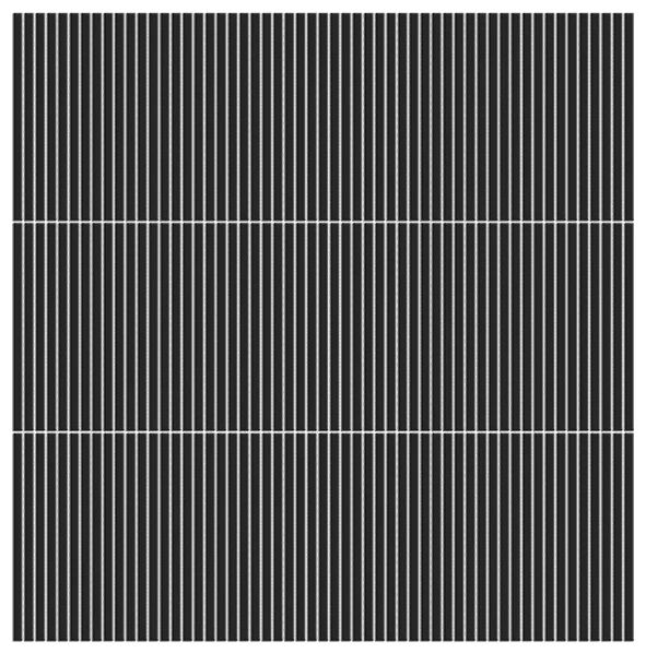 Produkt to mozaika szklana A-MGL04-XX-026 o wymiarach 29,9x29,5 cm, wykonana ze szklanych elementów. Dominującym kolorem jest czerń, z wyraźnym, kontrastowym rysunkiem cienkich, pionowych białych pasków na powierzchni mozaiki. Układ linii jest powtarzalny i precyzyjny, co nadaje jej regularnego, minimalistycznego charakteru.
