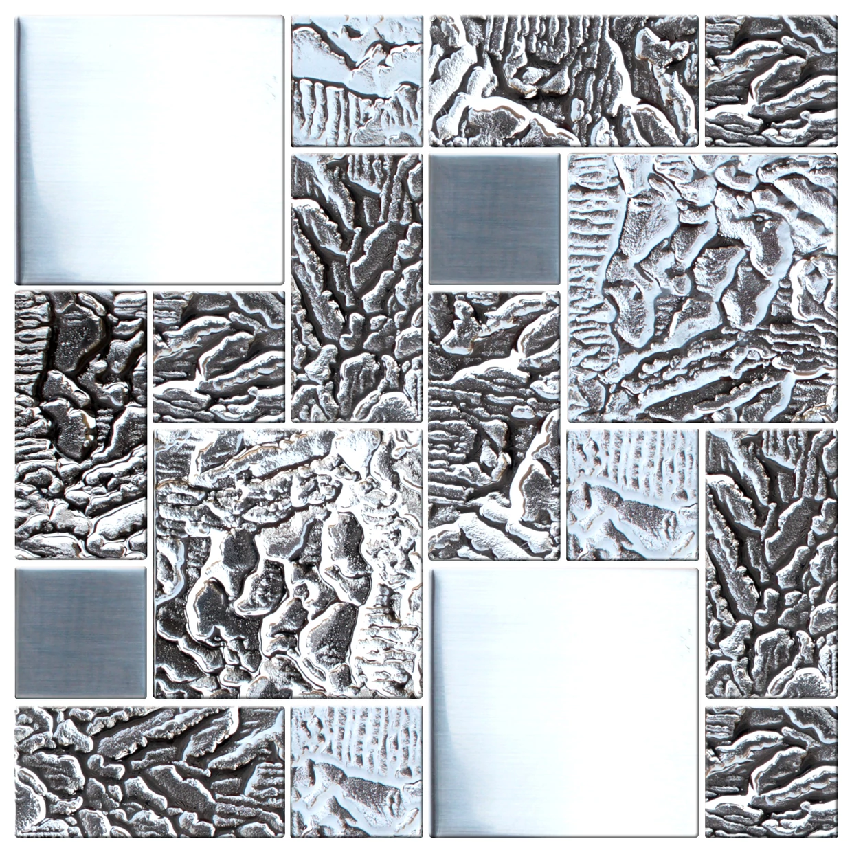 Mozaika Szklana A-MGL06-XX-007 30x30 to przykład dużej mozaiki, która wyróżnia się złożonym wzorem z różnej wielkości elementów. Jej powierzchnia jest błyszcząca, co widać w jej metalicznym wykończeniu, gdzie gładkie, jednolite kwadraty przeplatają się z detalami o wyraźnie trójwymiarowej fakturze. Taki układ tworzy ciekawy kontrast, podkreślając zarówno głębię jak i geometryczną regularność poszczególnych kafelków. Wzory o nierównej powierzchni mają charakterystyczne przetłoczenia, które nadają mozaice unikalny wygląd.