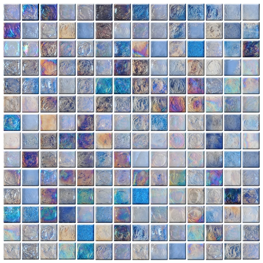 Mozaika szklana A-MGL08-XX-045 o wymiarach 30x30 cm to zestaw niewielkich kwadratów o zróżnicowanym połysku i kolorystyce utrzymanej głównie w tonacji niebiesko-szarej z akcentami beżu i fioletu. Szklane elementy mają nieregularną, lekko wypukłą powierzchnię z widocznymi fakturami w formie delikatnych fal i plam, które zmieniają się pod różnym kątem światła. Utrzymanie takiej wielkości i intensywności detalu sprawia, że każdy fragment mozaiki przyciąga wzrok, ale całość tworzy harmonijną, choć niejednolita strukturę.