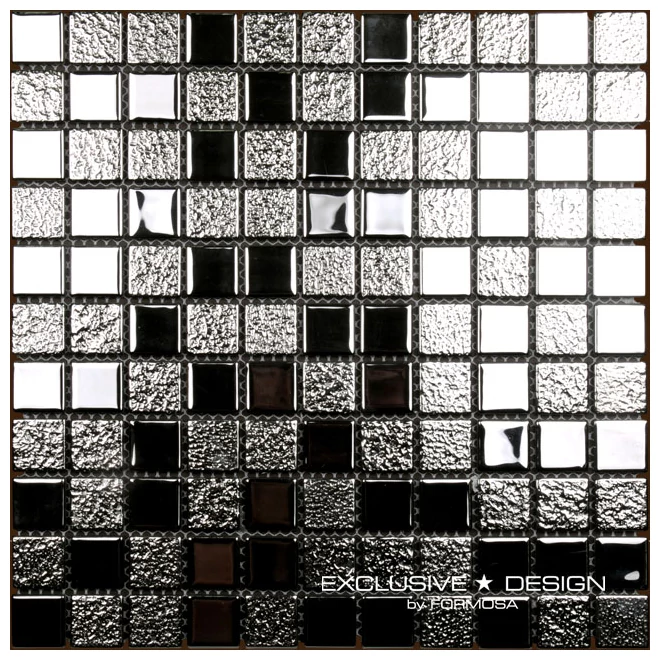 Mozaika Szklana A-MGL04-XX-007 30x30 to rozwiązanie wyróżniające się prostą, lecz wyrazistą formą. Wzór tworzą kwadraty o różnych powierzchniach - połyskujące gładkie tafle kontrastują z matowymi, strukturalnymi elementami. Cztery warianty powierzchni sprawiają, że całość zyskuje głębię i ciekawą teksturę, mimo ograniczonej kolorystyki z dominującą czernią, bielą oraz srebrzystymi refleksami.