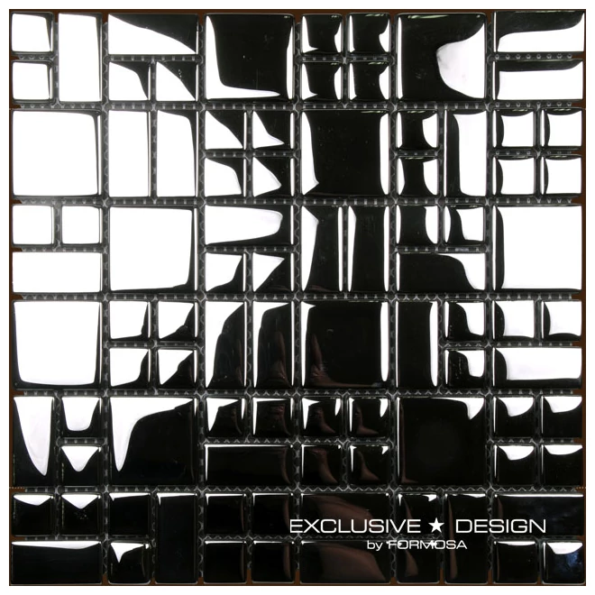 Mozaika Szklana A-MGL08-XX-017 30x30 od producenta Midas prezentuje się jako zestaw różnorodnych, błyszczących czarnych elementów w nieregularnych kształtach. Zróżnicowanie wielkości i form poszczególnych fragmentów nadaje jej dynamiczny charakter, przyciąga uwagę i pozwala na nieoczywiste aranżacje. Powierzchnia mozaiki jest mocno błyszcząca, co podkreśla intensywność koloru i zyskuje efekt głębi.