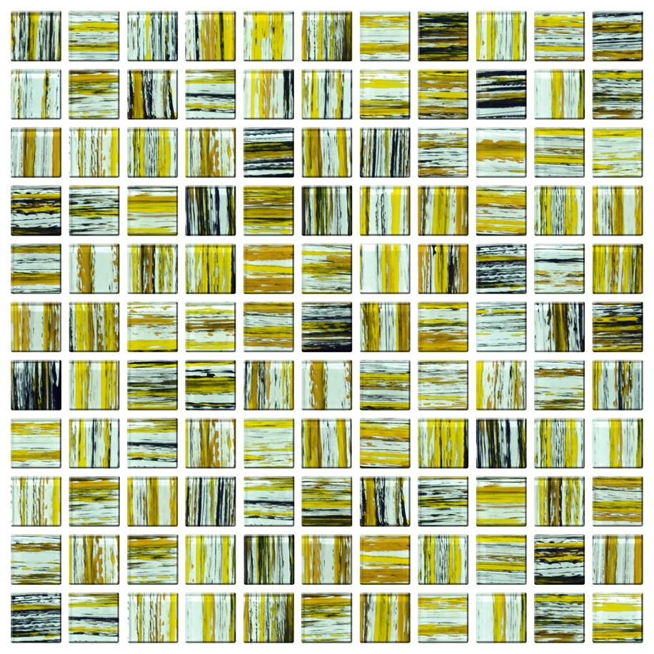 Mozaika Szklana A-MGL04-XX-002 30x30 to wyraźna propozycja dla tych, którzy szukają elementów z wyrazistym charakterem. Kolory zdecydowanie dominujące to różne odcienie żółci, przeplatane czernią i odrobiną bieli. Wzory nie są jednorodne - każdy kafelek cechuje się unikalnym układem smużek i pasów, co nadaje każdemu fragmentowi indywidualny charakter. Ten efekt nadaje całemu panelowi nieregularności, która może ciekawie ożywić przestrzeń.