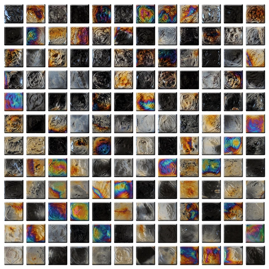 Ta duża mozaika szklana z kolekcji Mozaika Szklana marki Midas to zestaw kafelków, które przykuwają uwagę nieregularnym, a jednocześnie wyraźnym wzorem w jasnych, szarych, czarnych, brązowych i wielobarwnych tonacjach. Każdy element mozaiki ma wyraźną, lekko pofalowaną powierzchnię, która odzwierciedla światło w różnych kierunkach, podkreślając jej charakter i strukturalną głębię.