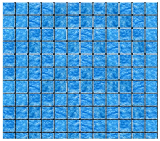 Ta duża mozaika szklana wyróżnia się głębokim, intensywnym odcieniem niebieskiego. Każdy kwadrat jest delikatnie zróżnicowany pod względem tonacji, co nadaje całości ciekawą fakturę wizualną. Odcień kojarzy się z klasycznym błękitem - zupełnie nie jest jednolity, co wyklucza efekt monotonii i sztuczności. Granice między elementami są wyraźne, co podkreśla charakterystyczny rysunek siatki.