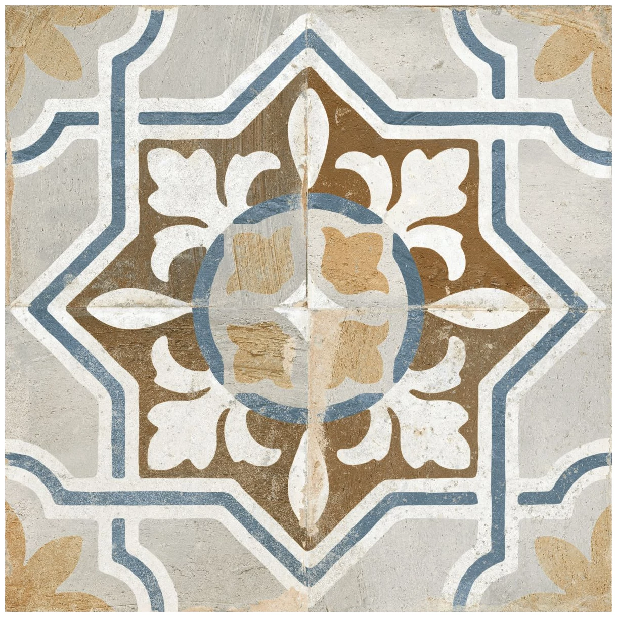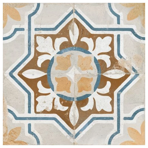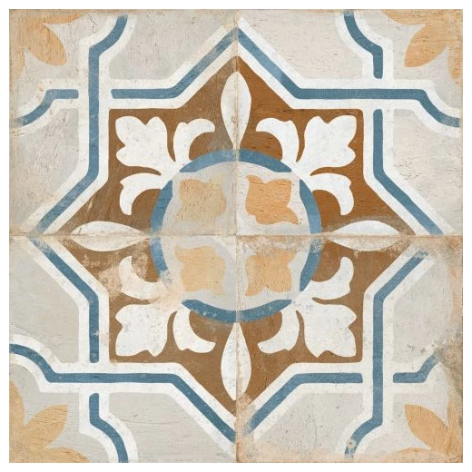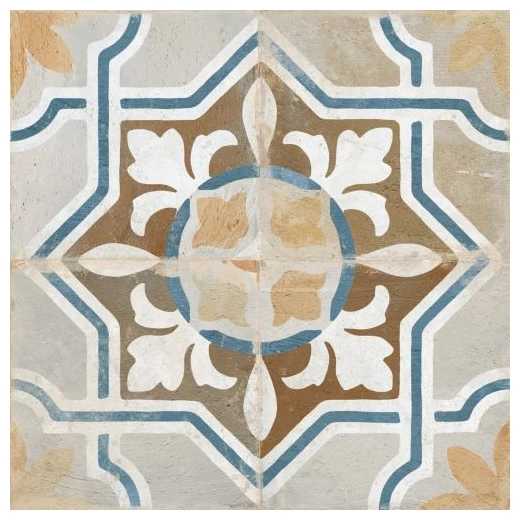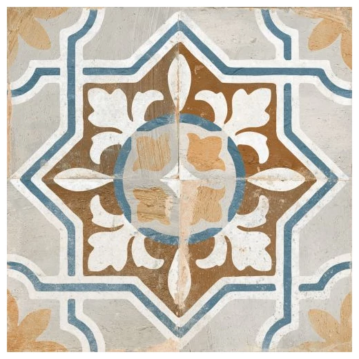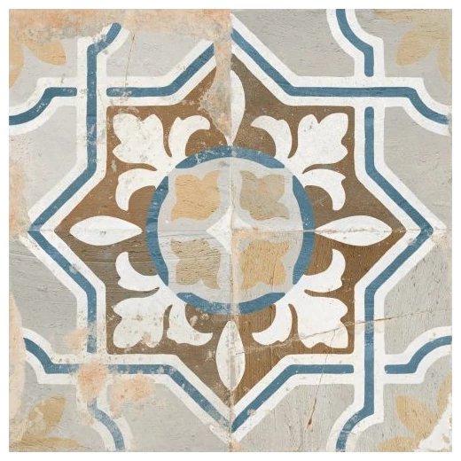 FS Seal to duża płytka podłogowa o wymiarach 45x45 cm, która od razu rzuca się w oczy dzięki skomplikowanemu wzorowi geometryczno-roślinnemu. Kafle tworzą charakterystyczny, wieloelementowy motyw z nutą błękitu, beżu i bieli na matowej powierzchni. Powierzchnia ma wyraźną fakturę, co nadaje płytkom autentyczny wygląd i podkreśla ich naturalny charakter. Kolory nie są krzykliwe, a mimo to przyciągają uwagę i mogą stanowić centralny punkt aranżacji pomieszczenia.