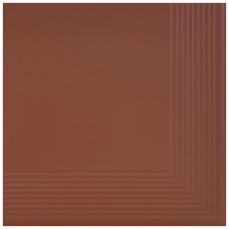 Stopnica w odcieniu burgunda ma wyraźny, ciepły kolor, który trudno przeoczyć. To intensywny, jednolity odcień, bez zbędnych wzorów czy ciemniejszych plam. Matowa powierzchnia sprawia, że płytka nie odbija światła, co wpływa na estetykę i użytkowanie - nie ma olśniewających refleksów, które mogłyby rozpraszać. Dodatkowo, narożna forma stopnicy pozwala na wygodne dopasowanie do schodów, ponieważ kształt jest precyzyjnie przemyślany.