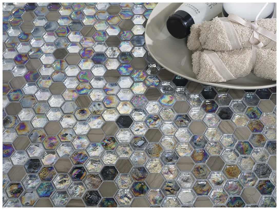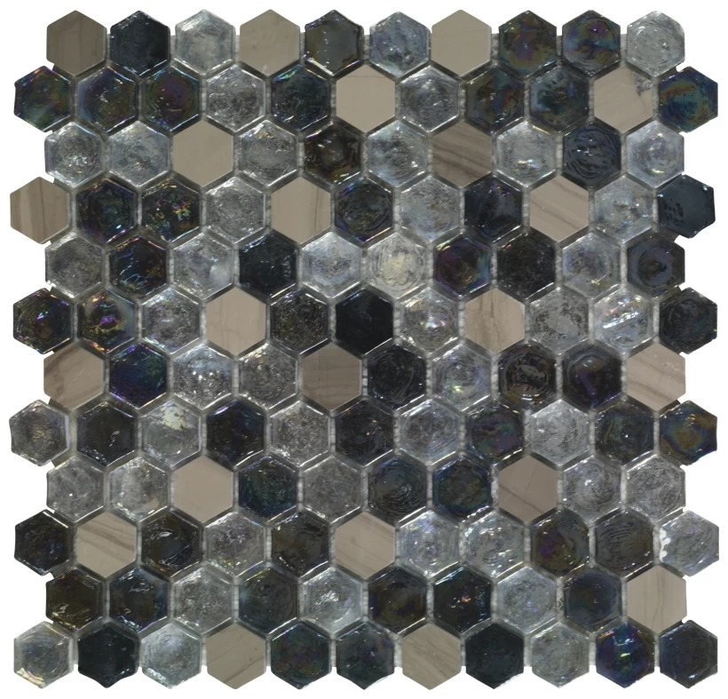 Mozaika ma dość wyrazisty charakter, zwłaszcza dzięki różnorodności strukturalnej poszczególnych heksagonów, które dają subtelne przestrzenne efekty. Nie jest to jednolita płaszczyzna - tutaj każdy element może inaczej odbijać światło, co podkreśla oryginalność i wizualną złożoność materiału.
