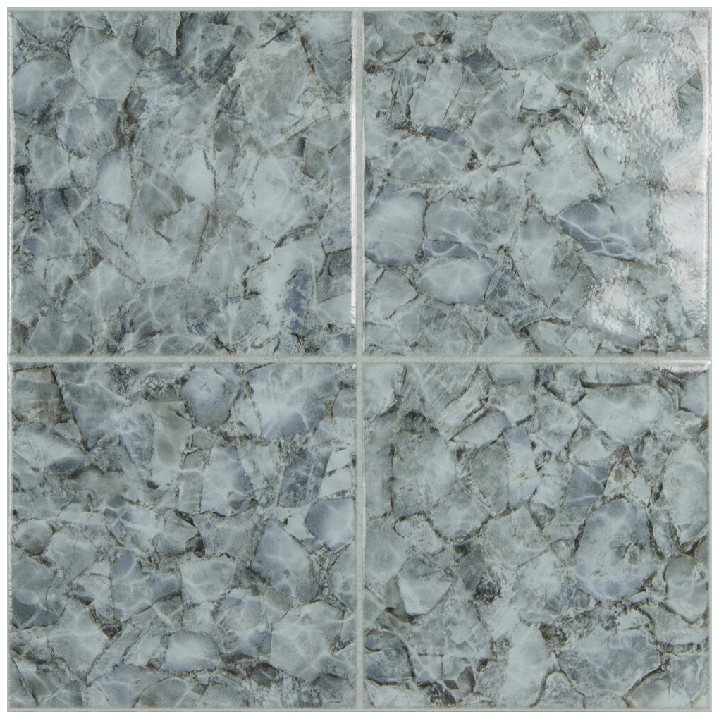 Duży format płytek Naxos Turquesa widoczny jest w modulacji wzoru: każdy element tworzy spójną, kamienną kompozycję w tonacji chłodnych szarości i błękitów. Powierzchnia jest błyszcząca, co uwydatnia nieregularne plamy i subtelne przejścia kolorystyczne. Krawędzie płytki wydzielone są widocznymi fugami, co jasno pokazuje sposób układania w powtarzalnych polach.