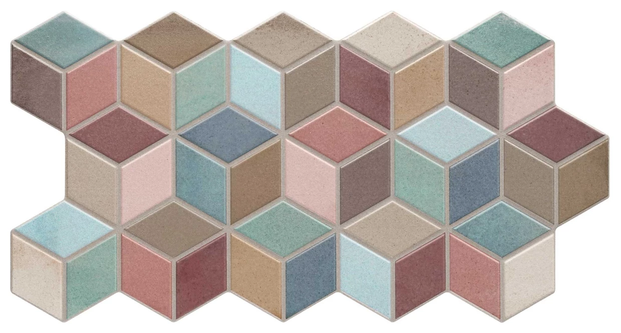 Duży gres heksagonalny z kolekcji Rhombus oferowany przez hiszpańskiego producenta Realonda jest wyrazem konkretnej, geometrycznej formy. Jego kształt to sześciokąt, dzięki czemu można układać go w regularne, powtarzalne wzory, które od razu przyciągają wzrok. Kolory, które występują na płytce, to mieszanka pastelowych tonów - beże, odcienie różu, niebieskiego oraz zieleni. Nie ma tu błysku, powierzchnia jest matowa, co nadaje całości bardziej stonowany charakter i sprawia, że gres wygląda na naturalny i surowy. Widać wyraźnie granice poszczególnych barw, podkreślone delikatnie konturami. To zróżnicowanie prowadzi do ciekawego zgeometryzowanego wzoru, który nie jest monotematyczny.