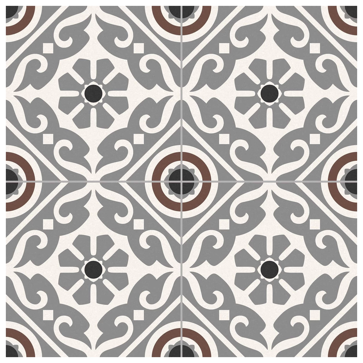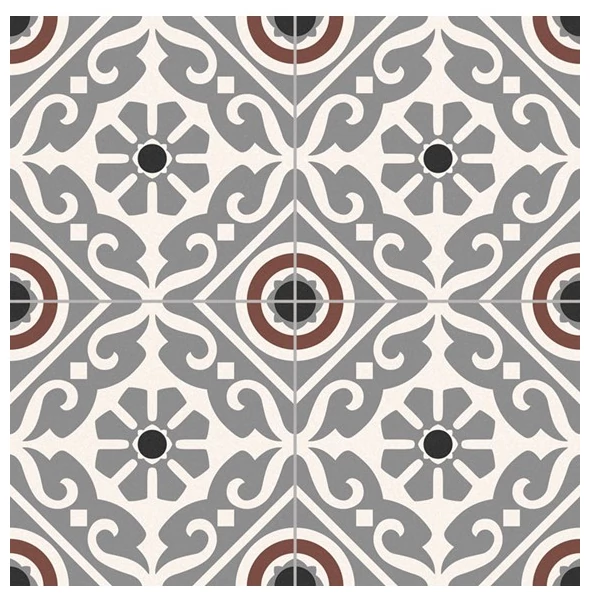 Płytka z kolekcji Musa charakteryzuje się dużym formatem 33,15x33,15 cm, który robi wrażenie nie tylko swoją wielkością, ale i graficznie wyraźnym wzorem. Szaro-białe elementy z subtelną czerwonawo-brązową otoczką tworzą geometryczną mozaikę, która od razu przyciąga wzrok. Matowa powierzchnia zapobiega odblaskom i nadaje naturalny, lekko surowy charakter. Taki gres to coś więcej niż tylko praktyczność - to element poprawiający wizualne walory przestrzeni.