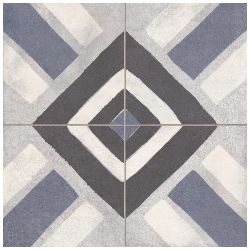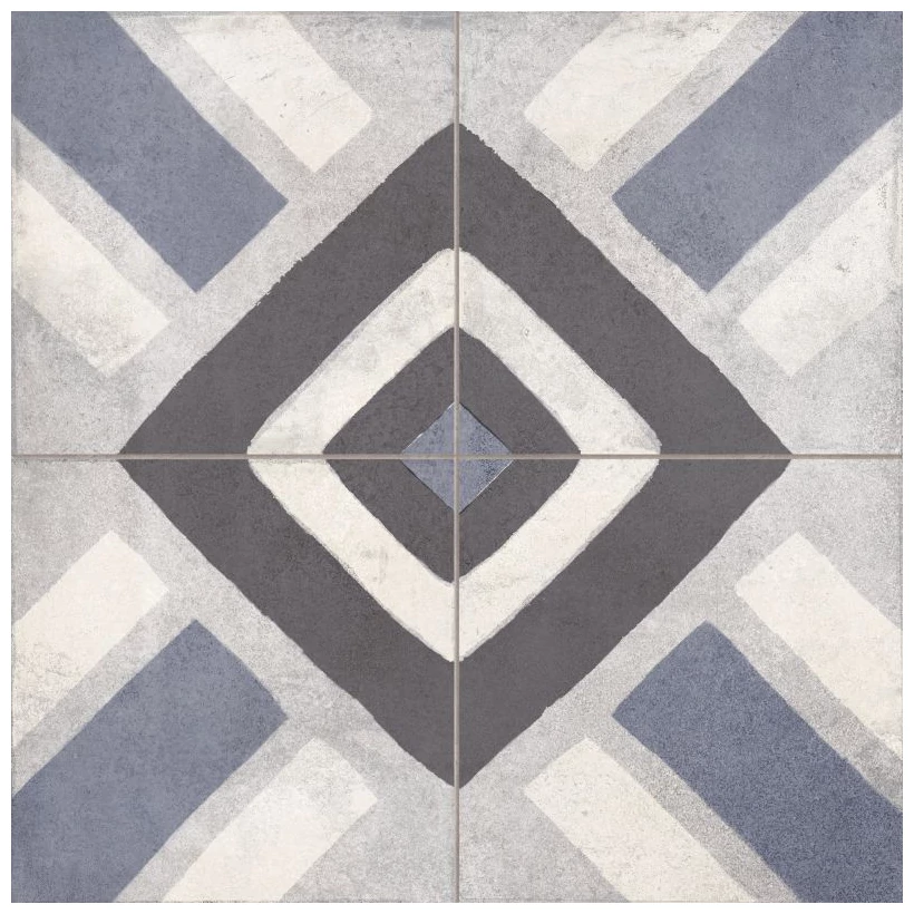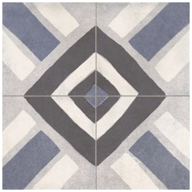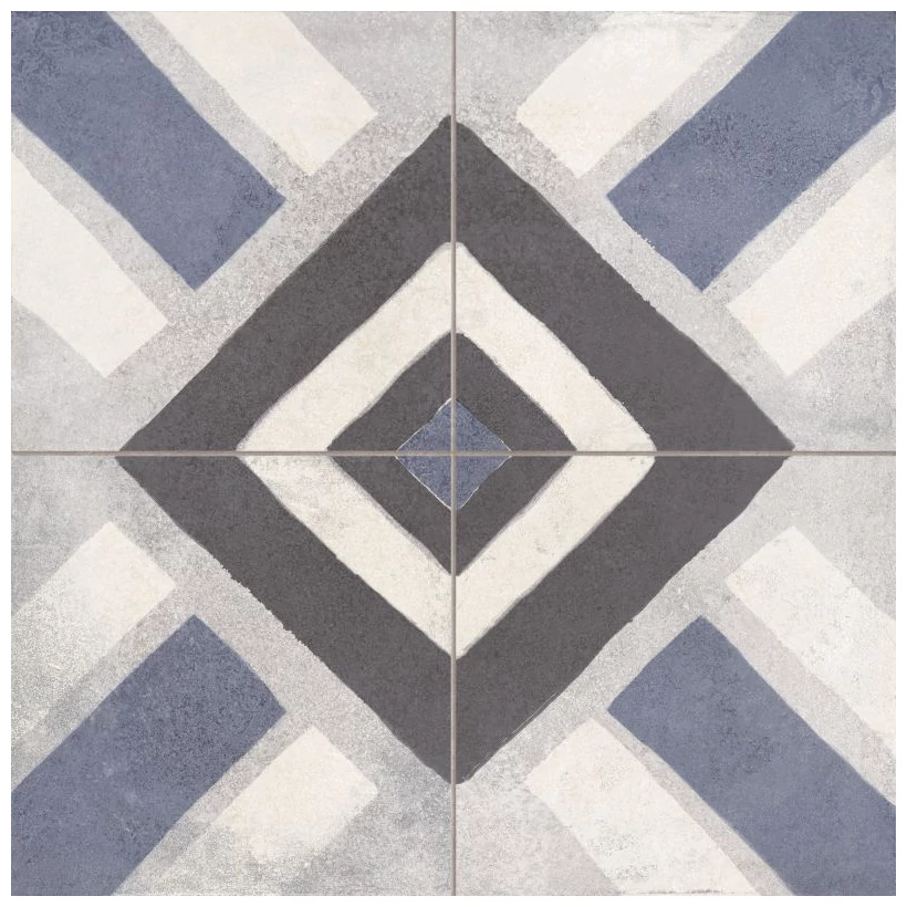 FS Sena Blue gres 45,2x45,2 to produkt, którego wzór opiera się na mocnych, geometrycznych kształtach. Na matowej powierzchni widzimy wyraźne, proste linie i kwadraty, które tworzą uporządkowany, ale nie przesadnie złożony motyw. Kolory to głównie odcienie szarości i niebieskiego, które nadają mu stonowany, nowoczesny charakter. Matowe wykończenie sprawia, że gres nie odbija światła intensywnie, co może być korzystne, gdy chcemy uniknąć efektu błysku na podłodze.