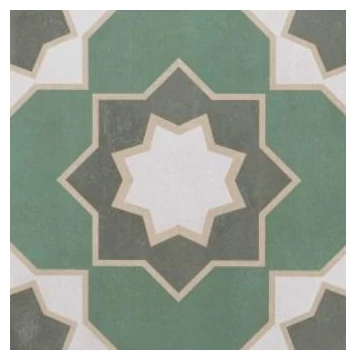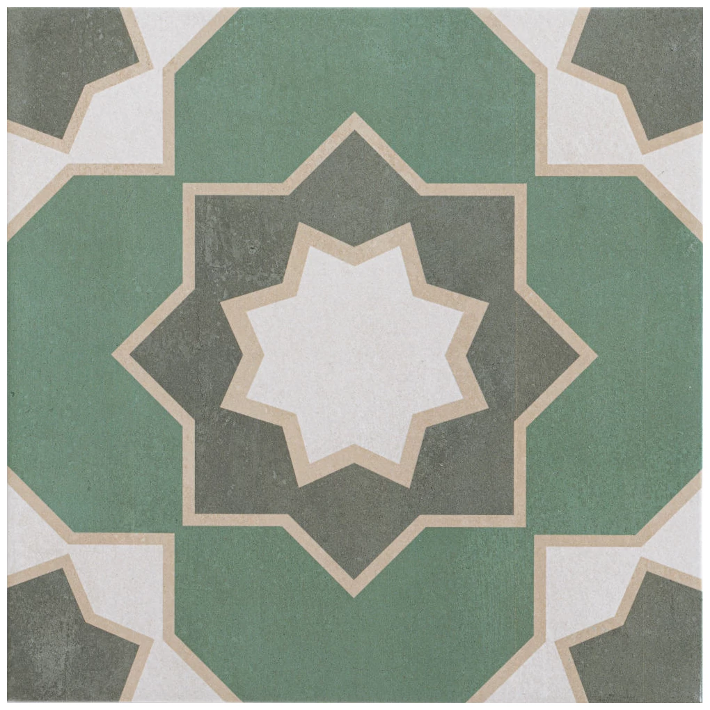 Izmir Olive gres 33x33 to produkt o wyraźnym, geometrycznym wzorze, który przykuwa uwagę swoją symetrią i wyrazistością kolorystyki. Dominuje na nim zieleń w różnych odcieniach, przełamana delikatnymi beżowymi liniami i neutralnym tłem. Matowa powierzchnia pozwala na subtelne odbicie światła, co nadaje płytce surowy, ale nowoczesny charakter. To gres który nie dominuje przestrzeni, lecz ją wyraźnie definiuje, dając możliwość stworzenia ciekawych aranżacji podłogowych.