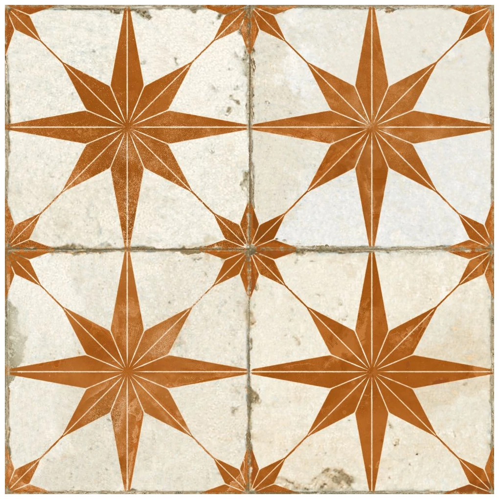 Płytka FS Star Oxide o wymiarze 45x45 cm przyciąga wzrok wyrazistym, geometrycznym wzorem. Główny motyw to ośmioramienna gwiazda w ciepłym, ceglastym kolorze, wyraźnie nawiązująca do rustykalnych klimatów. Jasne, lekko przybrudzone tło kontrastuje z mocnym, rdzawym akcentem, tworząc efekt postarzenia i autentyczności. Całość zdaje się opowiadać historię użytkowania i czasu, co przekłada się na wyrazistość i niejednorodność powierzchni.