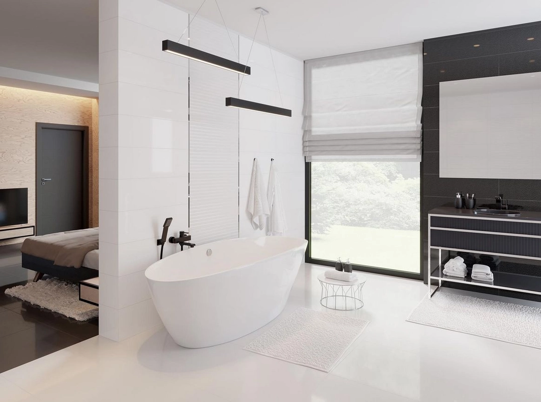 W łazience umożliwia stworzenie czystej i uporządkowanej przestrzeni, gdzie higiena jest łatwa do zachowania. Błyszcząca powierzchnia płytki ułatwia pielęgnację oraz odbija światło, co może optycznie powiększać pomieszczenie.