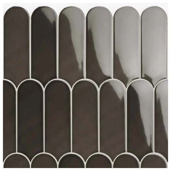 Płytki FAN MIX Black to ciemna glazura ścienna o wymiarach 7,2x19,5 cm w formie wąskich prostokątów z zaokrąglonymi końcami. Powierzchnia jest błyszcząca, co nadaje frontowi lekki połysk i subtelne odbicia światła. Kolorystyka obejmuje różne odcienie grafitu i antracytu, które płynnie ze sobą współgrają, tworząc ciekawą i nieco stonowaną kompozycję. Takie zestawienie pozwala uniknąć monotonii i wprowadza odrobinę zmienności w jednolitym wykończeniu.