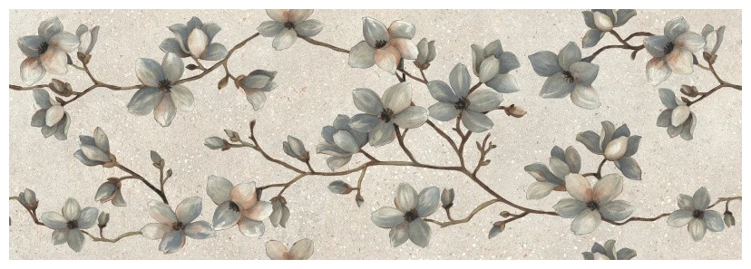 Asphalt OFF White Sumire to płytka ścienna o wymiarze 30x90 cm, która łączy w sobie prostotę i subtelność detali. Jej matowa powierzchnia zapewnia neutralny, ale niepozbawiony charakteru, jasny podkład w odcieniach bieli z delikatnymi beżowo-szarymi tonami tła. Na tym tle znajdują się dokładnie odwzorowane gałązki z kwiatami magnolii w spokojnych barwach - szarość kwiatów przełamana jest ciepłą, delikatną różowo-brązową nutą łodyg.