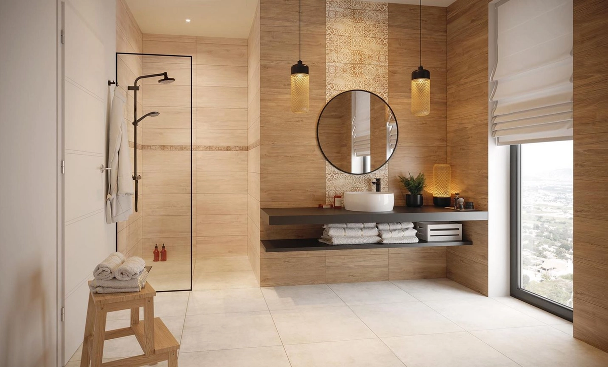 Płytka dobrze mieści się w klasycznych i bardziej nowoczesnych wnętrzach, gdzie chcemy połączyć naturalny charakter drewna z praktycznością ceramiki. Nie tylko nadaje wyrazistości ścianom, ale także ułatwia zachowanie higieny i trwałości powierzchni.