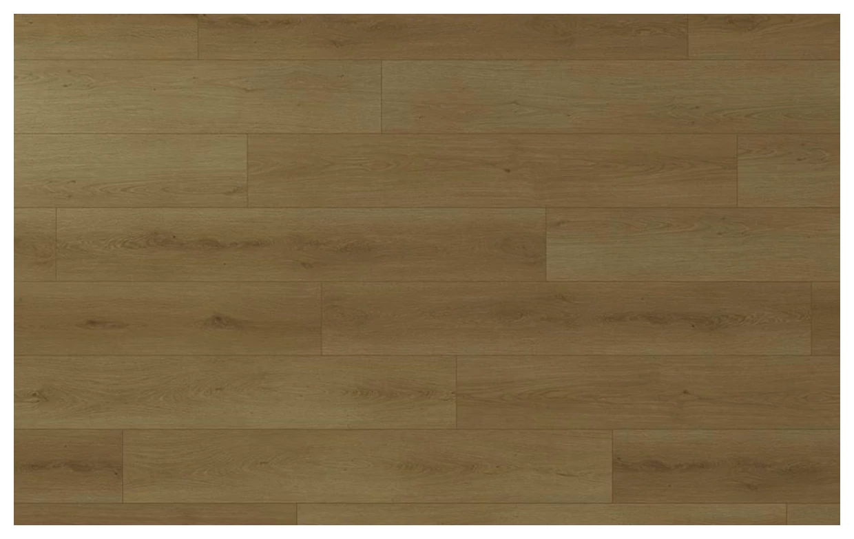 Panel winylowy Moorea prezentuje wyraźny, stonowany rysunek drewna w odcieniu średnio-brązowym. Deski mają długie, wyraźne pasy słojów oraz sporadyczne sęki, które nadają podłodze naturalny charakter bez przesadnej dekoracyjności. Powierzchnia wygląda na matową, co ogranicza odblaski i podkreśla strukturę drewna.