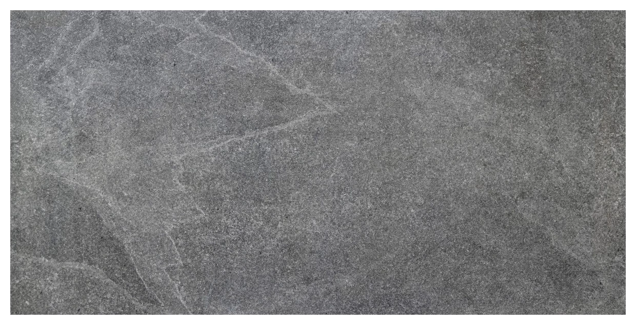Grafitowy odcień płytki widoczny jest już przy pierwszym spojrzeniu - ciemna, stonowana baza z subtelnymi, jaśniejszymi żyłkami. Powierzchnia lappato daje delikatny, lekko satynowy połysk, który łapie światło, ale nie odbija go nadmiernie. To nie surowy beton, lecz przemodelowana faktura, która oddaje industrialny charakter materiału bez efektu sztucznej imitacji.