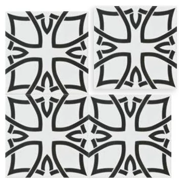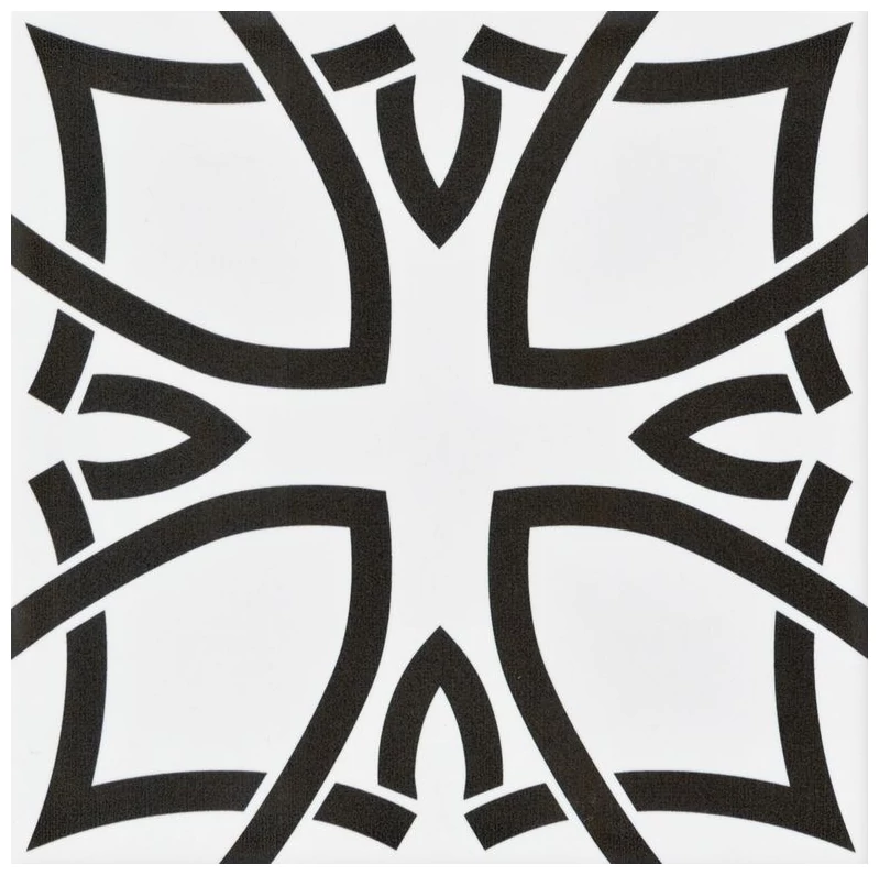 Produkt prezentuje spójny, geometryczny wzór wykonany w kontrastujących kolorach czerni na białym tle. Geometryczne linie tworzą symetryczny, czteroramienny motyw, który przyciąga uwagę swoją strukturą, a zarazem zachowuje minimalistyczną prostotę. Takie wykończenie daje wyraźny akcent wizualny, który może zdefiniować charakter całej przestrzeni.
