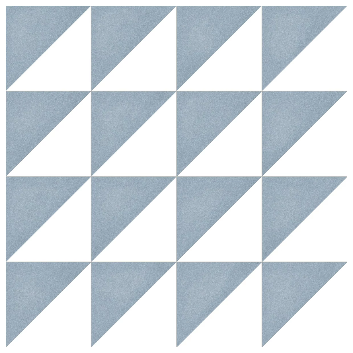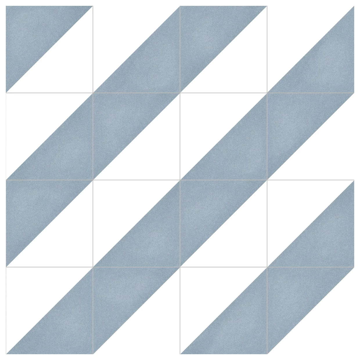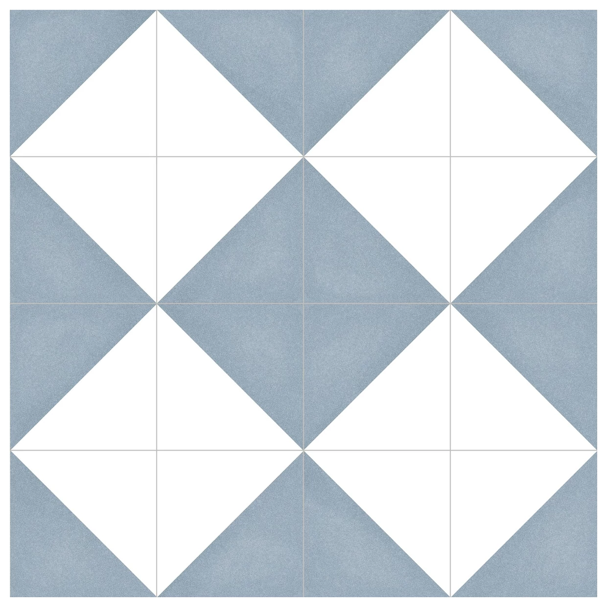 Model TRE Nube gres 20x20 to propozycja o wyrazistym, geometrycznym wzorze. Prosty podział na białą i błękitną część płyty nadaje jej charakteru, który nie męczy, ale jednocześnie jest zauważalny. Te dwie barwy ułożone diagonalnie tworzą efekt lekkości i porządku. Matowa powierzchnia sprawia, że tafla nie przyciąga zbytnio światła, co podkreśla stonowany, ale konkretny efekt końcowy. Ten mały rozmiar płytki - 20x20 cm - pozwala na różnorodność układów i aranżacji podłogi.
