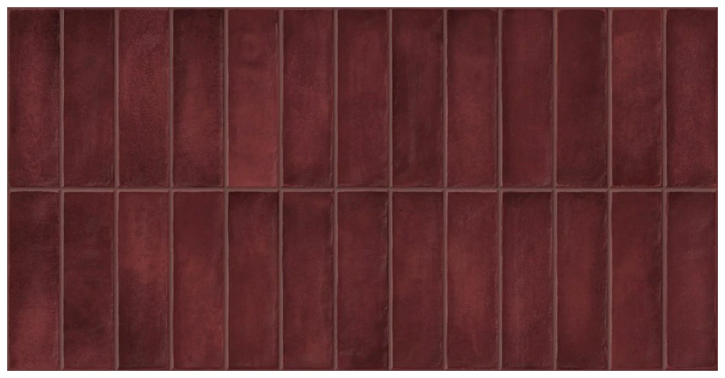 Głęboki burdeos dobrze współgra z jasnymi spoinami lub ciemniejszymi dodatkami metalicznymi. Można go zestawiać z neutralnymi płytkami podłogowymi lub z drewnopodobnymi materiałami, żeby złagodzić intensywność koloru. Układ pionowy wydłuża przestrzeń w pionie, układ poziomy daje bardziej klasyczny, stonowany efekt.