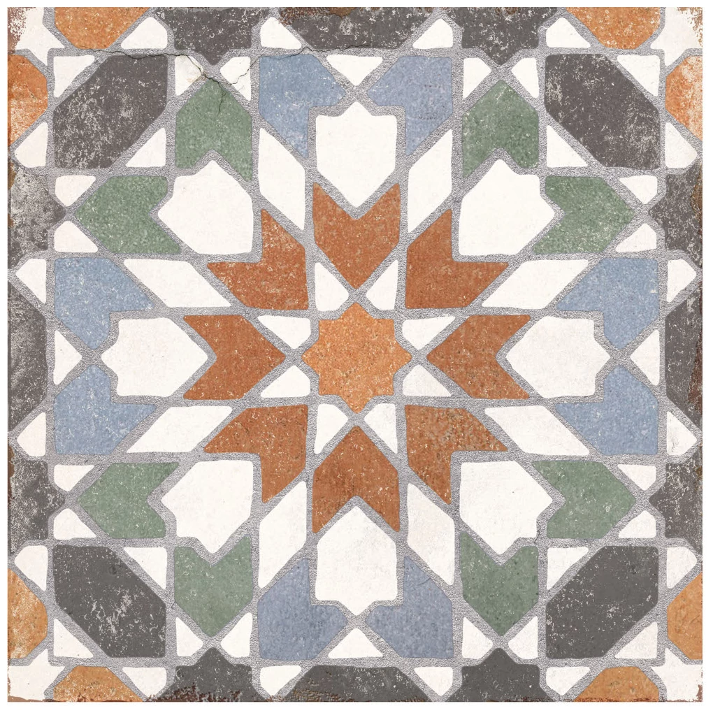 Andalusia Zaida gres 20x20 to mały format, który od razu przyciąga uwagę złożonym wzorem ornamentu. Kolorystyka łączy ciepłe odcienie terakoty z chłodniejszymi akcentami zieleni i błękitu oraz szarości. Całość ma matową powierzchnię, co dodaje jej autentyczności i zbliża do stylu retro. Ten gres hiszpański wyróżnia się precyzją wzoru oraz drobnymi śladami postarzenia, które nie są niedoskonałością, a zamierzonym elementem designu, podkreślającym historyczny charakter.