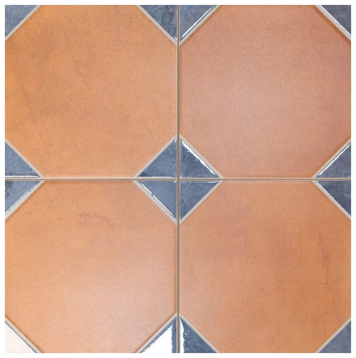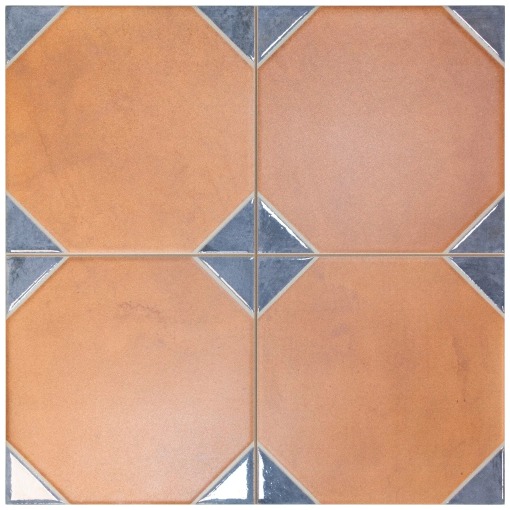 Dover Cotto Blue to gres podłogowy, który przyciąga uwagę swoim wyraźnym wzorem geometrycznym. Płytki mają kształt kwadratów z oszlifowanymi narożnikami, tworząc charakterystyczne ośmiokąty w ciepłym odcieniu terakoty. Niebieskie trójkątne akcenty w rogach każdej płytki skutecznie przełamują jednolitość, dając wyrazisty efekt wizualny, który można określić jako retro, ale nie archaiczny. Całość przypomina klasyczny gres hiszpański, który odnajdzie się w przestrzeniach potrzebujących nieco konkretnej, ale także atrakcyjnej estetyki.