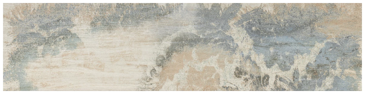 Podłogowy gres hiszpański Camper Stamp to płytka o powierzchni matowej, która przywodzi na myśl drewno, choć jest wykonana z trwałego gresu. Kolorystyka jest złożona i nieregularna, przełamana elementami, które przypominają efekt postarzonej, rustykalnej powierzchni. Widoczne są subtelne przejścia tonalne między beżem, błękitem a szarością, co nadaje całości wyrazisty, a jednocześnie naturalny charakter.