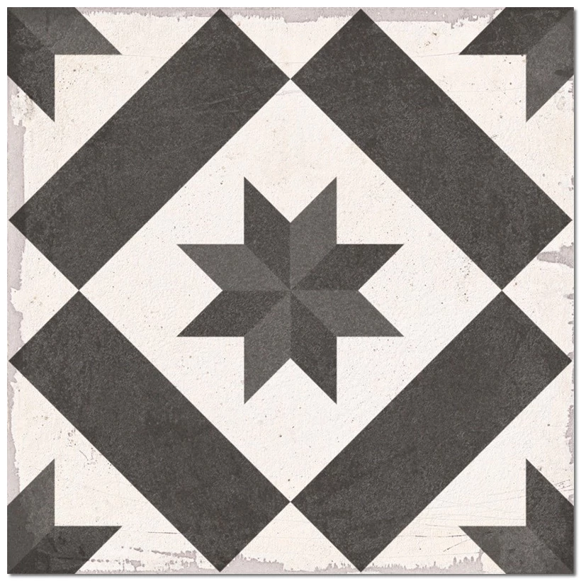 Płytka Chez Coco Star o wymiarze 25x25 cm wyróżnia się wyrazistym, geometrycznym wzorem, który od razu przykuwa uwagę. Czarno-białe, zdecydowane linie tworzą rytm i strukturę, która pasuje do wnętrz ceniących tradycyjne, ale nieprzesadzone akcenty. Matowa powierzchnia matuje refleksy światła, nadając naturalny, autentyczny wygląd, który nie męczy wzroku. Na krawędziach pojawiają się subtelne, przecierane efekty, które sugerują lekko zużyty, ale stylowo odnowiony gres hiszpański w stylu rustykalnym podłogowy.