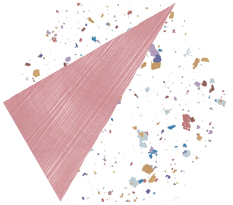 Stracciatella Pink Natural to gres podłogowy o powierzchni w efekcie lastryko, utrzymany w delikatnych różowych tonach. Nieregularne, geometryczne wzory w wielobarwnych drobinkach nadają mu nieoczywistego, a jednocześnie uporządkowanego charakteru. Kształt heksagonalny wychodzi poza typowe prostokąty - przyciąga wzrok i wprowadza nieco dynamiki do przestrzeni. Matowe wykończenie zabezpiecza przed refleksami światła, co pozwala skupić się na szczegółach wzoru bez męczącego połysku.