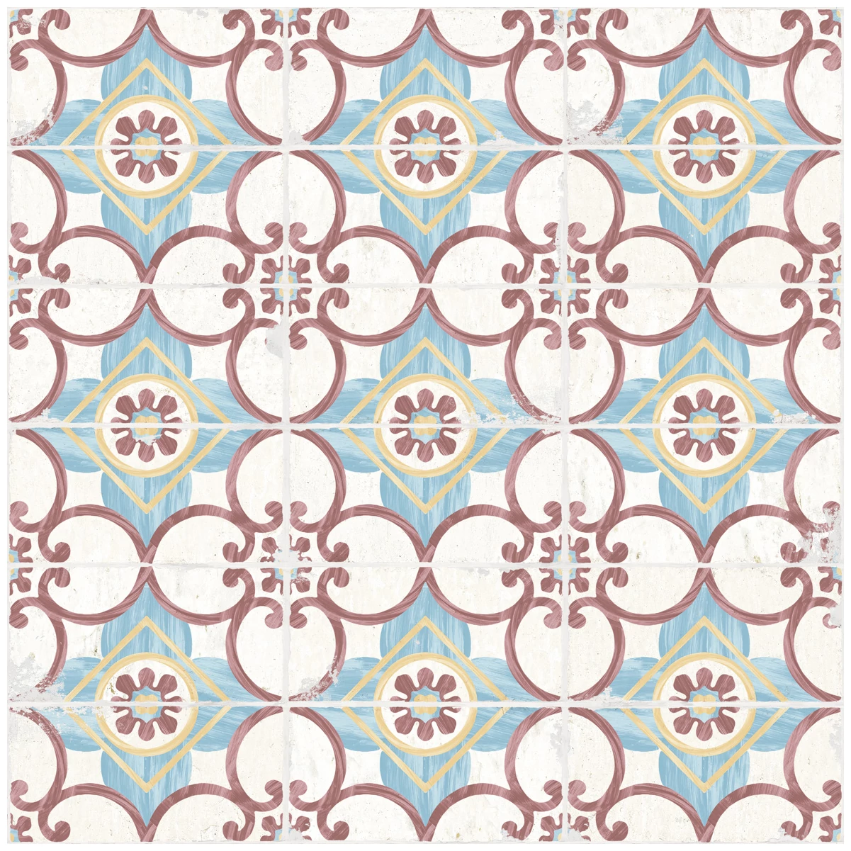 Gres hiszpański SAO Luis Azevedo z kolekcji Sao Luis to propozycja, która zwraca uwagę wzorem opartym na geometrycznych kształtach. Dominują kolory ziemi - ciepłe bordo w stylizowanych zawijasach, delikatny błękit oraz kremowe tło. Wzór na płycie sprawia wrażenie lekko postarzanego, co doskonale wpisuje się w estetykę vintage. To nie jest powierzchnia gładka i nowoczesna - matowa struktura i subtelne ślady imitujące czas nadają jej autentycznego charakteru.
