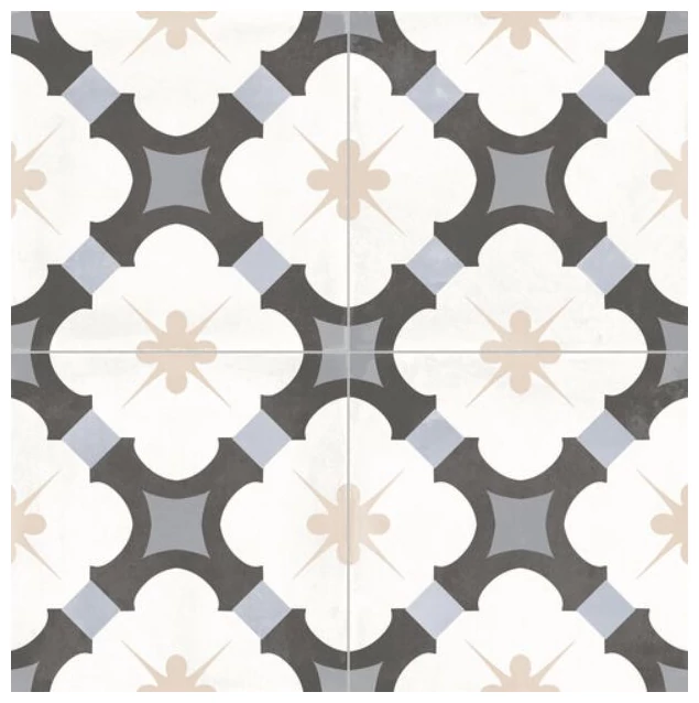 Aldana Midnight to płytka z kolekcji Aldana, produkowana przez EL Molino w Hiszpanii. Na pierwszy rzut oka dominuje tu powtarzalny, geometryczno-ornamentalny wzór w stonowanej palecie: jasne tło, ciemnoszare łuki, beżowe akcenty w środku motywu oraz drobne, niebieskoszare kwadraty łączące elementy. Wykończenie jest matowe, co ogranicza odblaski i podkreśla fakturę dekoru. Ten projekt sprawdza się jako gres hiszpański w stylu vintage na podłogę - wzór przypomina klasyczne kafle, ale forma i wykonanie pozostają nowoczesne.
