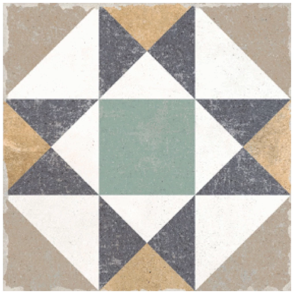 Gabana Kenitra to gres o wymiarach 20x20 cm, który od razu rzuca się w oczy oryginalnym, geometrycznym ornamentem. Jego wzór to starannie dobrane elementy w stonowanych kolorach - beżu, bieli, szarości oraz zieleni na środku. Całość ma matową powierzchnię o nieco ziarnistej fakturze, nadającą mu autentyczny charakter retro. Ten wzór przywodzi na myśl klasyczne, ale jednocześnie uniwersalne motywy, które mogą pasować do różnorodnych aranżacji.