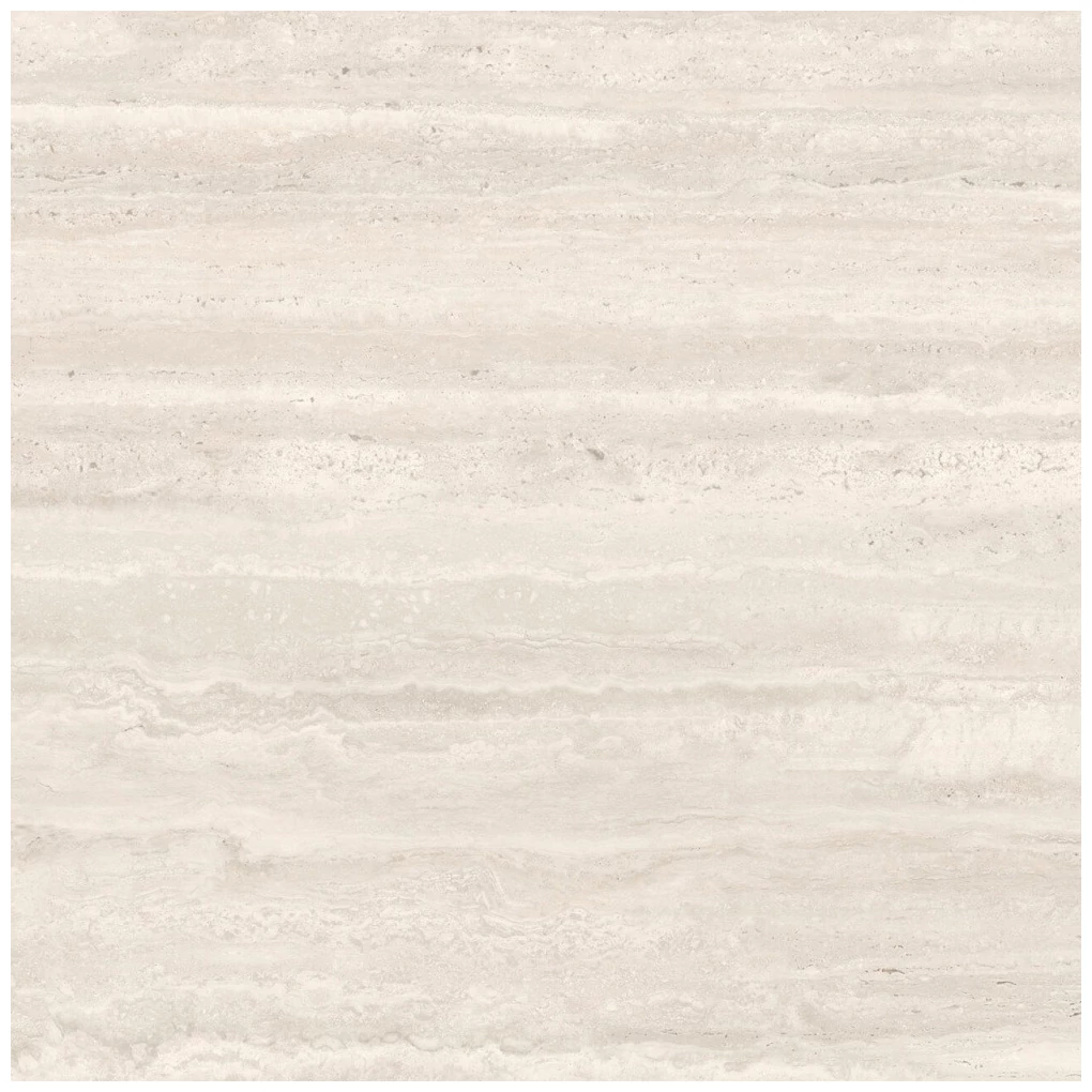 Stratos Vein Bone to wielkoformatowy gres o wymiarze 100,0 x 100,0 cm. Płytka prezentuje jasną, kremowo-beżową tonację z wyraźnymi, poziomymi żyłkami przypominającymi trawertyn. Powierzchnia jest matowa, co ogranicza odbicia światła i pozwala uzyskać stonowany efekt podłogi. Ten wygląd sprawdzi się tam, gdzie chcemy wprowadzić naturalny, uporządkowany rys kamienia, bez krzykliwych akcentów.