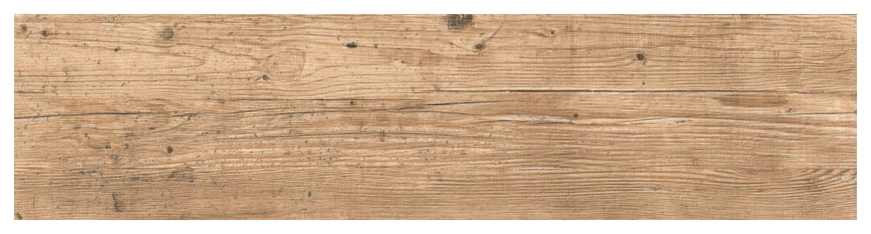Produkt przedstawia płytkę w formacie 30,0 x 120,0 cm o wyraźnej, drewnopodobnej fakturze. Kolorystyka to odcienie jasnego i średniego brązu z naturalnymi przejściami tonu oraz widocznymi usłojeniami i sękami. Powierzchnia jest matowa, co redukuje refleksy świetlne i podkreśla surowy charakter rysunku drewna.