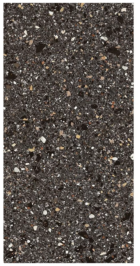 Alone Noche to wielkoformatowy gres polerowany 60x119,5 cm, który oddaje charakter naturalnego kamienia dzięki wyraźnej, ziarnistej fakturze. Kolory i nieregularne drobinki na powierzchni nadają mu surowy, ale jednocześnie uporządkowany wygląd. Czarna baza z akcentami bieli, beżu i brązu sprawia, że płytka ma głębię i ciekawą grę światła na błyszczącej powierzchni. To gres na podłogę imitujący kamień, który przykuwa wzrok bez zbędnej ornamentyki i pozwala na stworzenie nowoczesnej lub klasycznej aranżacji.