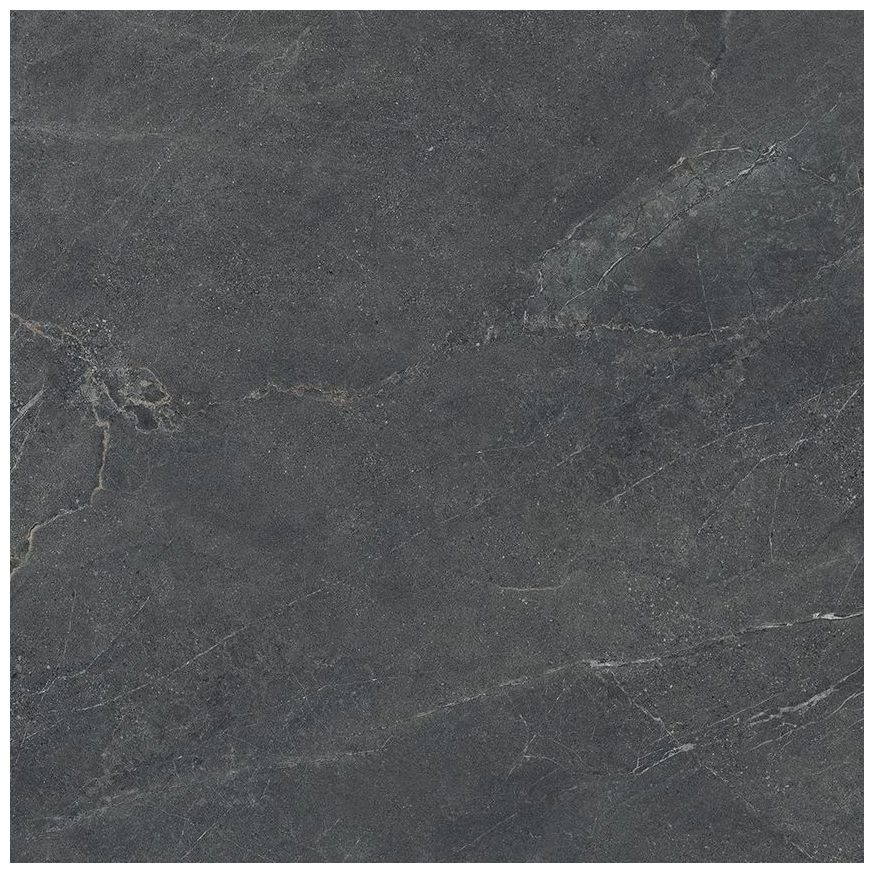 Ten gres podłogowy to wyrazista powierzchnia przypominająca autentyczny kamień. Ciemny odcień grafitu z delikatnymi, jasnymi żyłkami tworzy surowy, lecz uporządkowany wzór na kaflu o formacie 119,7x119,7 cm. Taki format pozwala na minimalistyczne układanie z mniejszą ilością fug, co podkreśla jednolitość kamieniopodobnej faktury. Produkt utrzymany jest w zasadzie w chłodnej tonacji, co ułatwia dopasowanie do nowoczesnych, jak i bardziej klasycznych aranżacji.