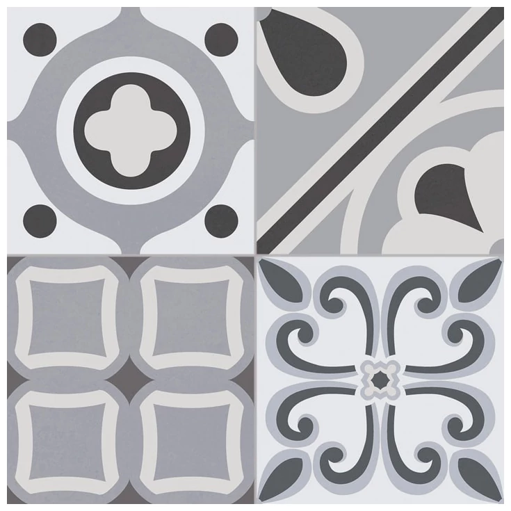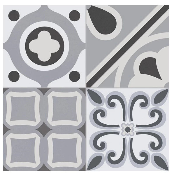 Lumier Black od Gayafores to gres patchwork podłogowy, który łączy w sobie różnorodne wzory w odcieniach szarości, bieli i czerni. Każda płytka o wymiarze 33,15x33,15 cm prezentuje inną kompozycję geometryczną i ornamentalną, co daje ciekawy efekt wizualny przy układaniu większych powierzchni. Matowa powierzchnia wzmacnia subtelność kolorów, zmniejszając refleksy świetlne i ułatwiając utrzymanie czystości. Wielkość płytek podkreśla ich detal oraz sprawia, że wzory dobrze się eksponują, nie przytłaczając przestrzeni.
