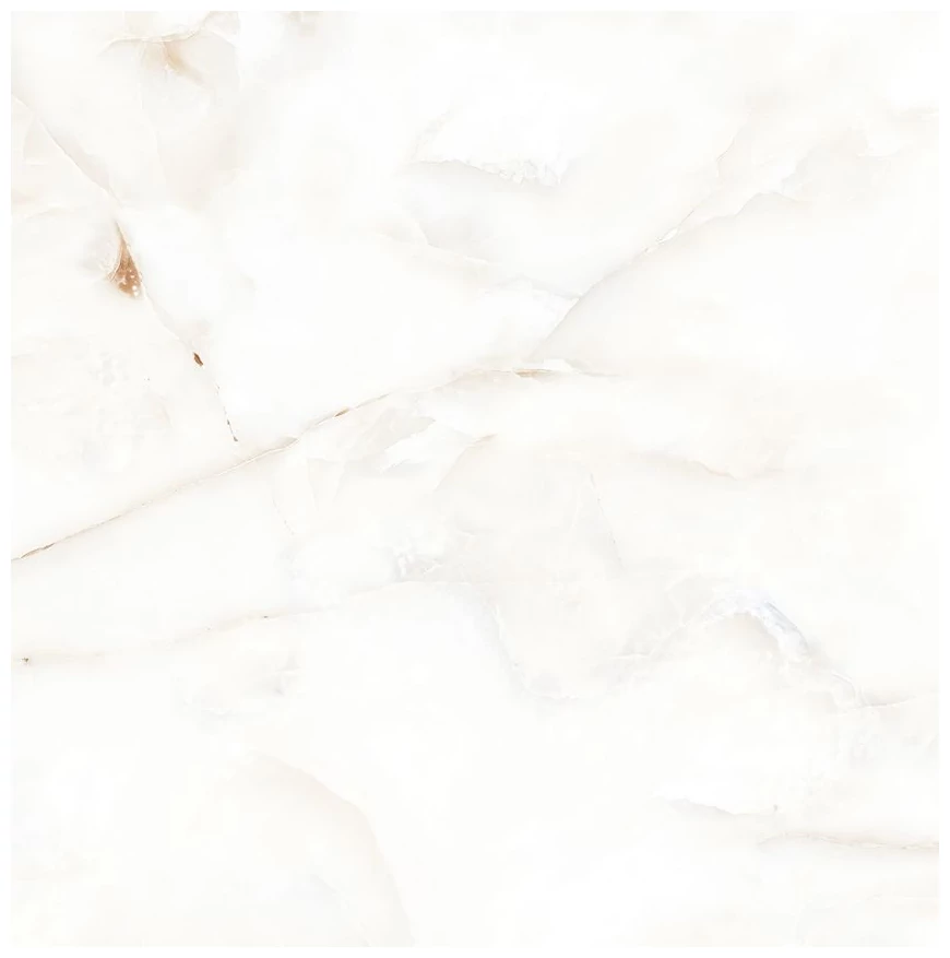 Onyx Blanco to wielkoformatowy gres podłogowy o wyraźnym, marmurowym efekcie. Kolorystyka widoczna na płytce to jasna, kremowo-biała baza z delikatnymi, beżowo-złotymi żyłkami. Powierzchnia jest matowa, co sprawia, że płytka zachowuje elegancki, stonowany charakter bez zbędnego połysku.