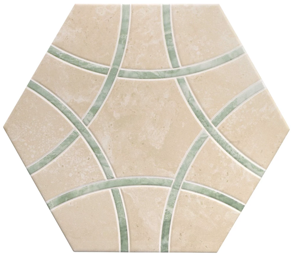 Lancaster Jungle gres o wielkości 28,5x33 cm wyróżnia się heksagonalnym kształtem, który nadaje mu nowoczesny charakter. Jego powierzchnia przedstawia delikatny marmurowy wzór w odcieniach beżu, urozmaicony cienkimi, zielonymi pasami ułożonymi w łukowate linie. Całość sprawia wrażenie uporządkowanego chaosu, bardziej naturalnego niż mechanicznego. To sprawia, że produkt przyciąga uwagę bez nadmiernej krzykliwości.