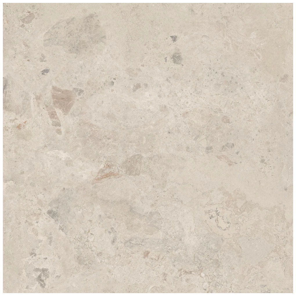 Stratos Breccia MUD to wielkoformatowy gres podłogowy o wyraźnym, kamiennym efekcie. Płyta w rozmiarze 100x100 cm prezentuje neutralną, beżowo-szarą paletę tonów z nieregularnymi przebarwieniami i plamkami imitującymi naturalne zlepieńce. Powierzchnia matowa podkreśla surowy, ale uporządkowany charakter - nie błyszczy, więc pomieszczenia wyglądają bardziej stonowanie i wyraźnie.