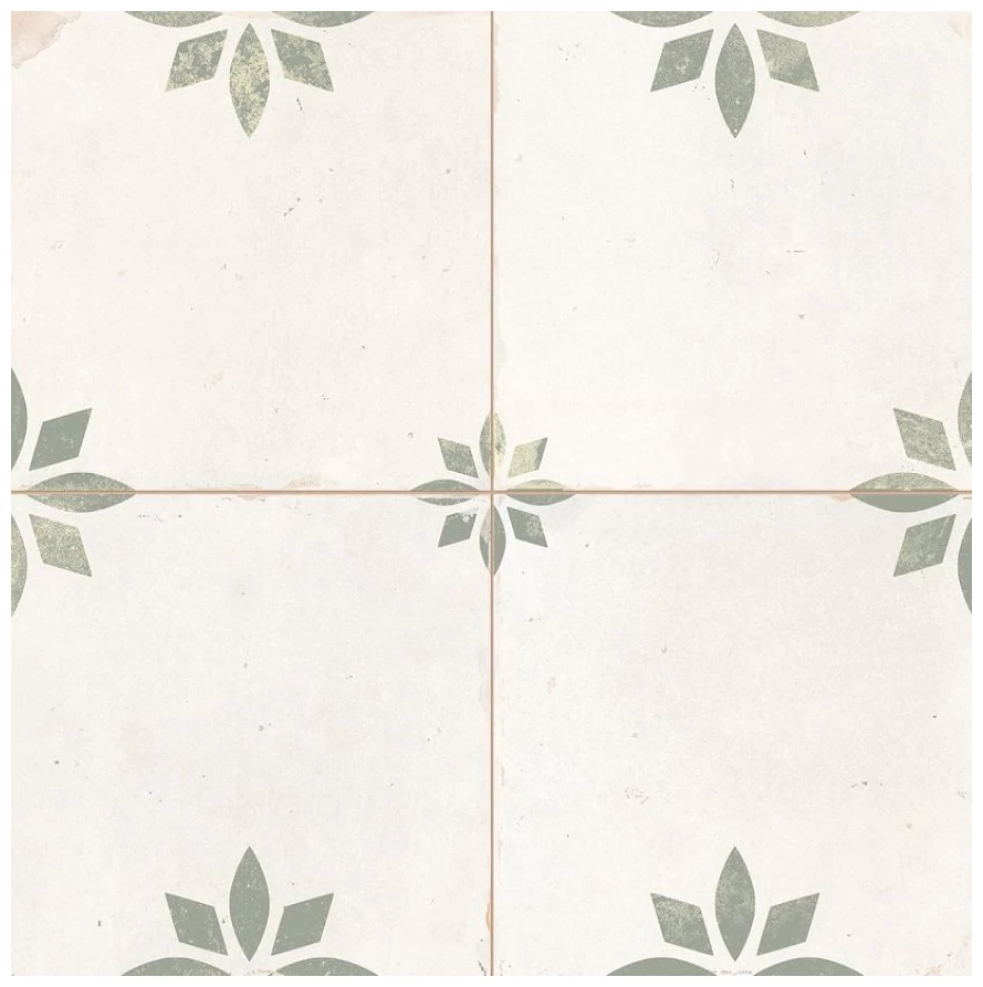 Duomo Savannah to gres szkliwiony o wymiarach 45,2x45,2 cm, który dzięki swojej matowej powierzchni zyskuje na subtelności. Kolorystyka jest stonowana, oparta na jasnej, niemal kremowej bazie z delikatnym, zielonkawym wzorem w narożnikach. To typowa realizacja hiszpańskiej estetyki w stylu retro, gdzie wzory są powściągliwe, a całość nie narzuca się rozmachem. Nie jest to produkt przesiąknięty intensywnością kolorów, lecz daje uczucie przestrzeni i czystości. Matowa faktura dodatkowo minimalizuje odbicia światła, co wpływa na praktyczność i wygodę użytkowania.