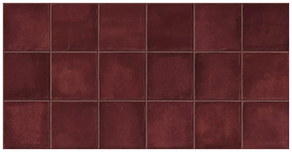 Deco Amaris Plus Burdeos to intensywny, bordowy odcień o wyraźnej, lekko nierównej fakturze szkliwa. Kolor jest głęboki, z subtelnymi przebarwieniami, które nadają płytce bardziej naturalny, ręcznie wykonany wygląd, na powierzchni widać różnice tonów, co unika monotonnego efektu.